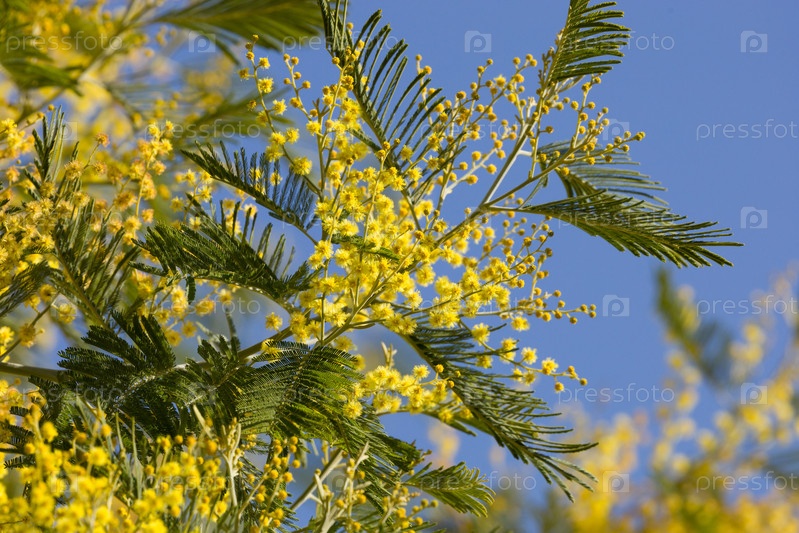 Цветы мимозы на фоне голубого неба