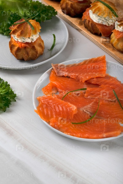 Филе копченой форели тонко нарезанное на керамической тарелке. Профитроли с соленой форелью и укропным сливочным сыром на спине. Праздничная закуска, фуршетное блюдо
