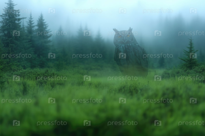 Полупрозрачная большая сова в туманном лесу, лесной дух