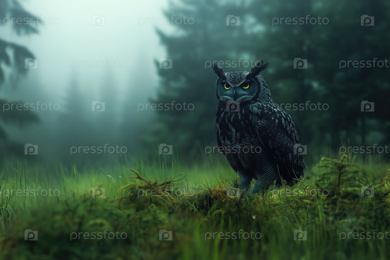 Черный филин в туманном лесу