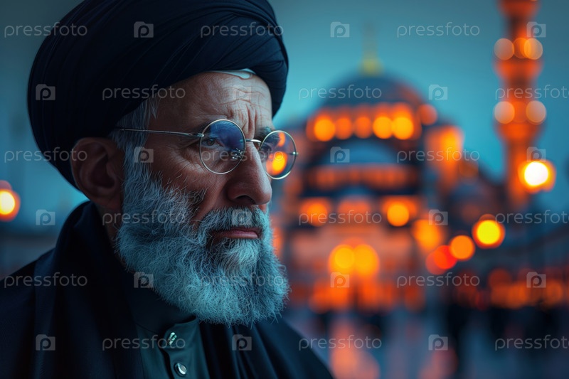 Портрет пожилого мусульманина на размытом ночном фоне с мечетью