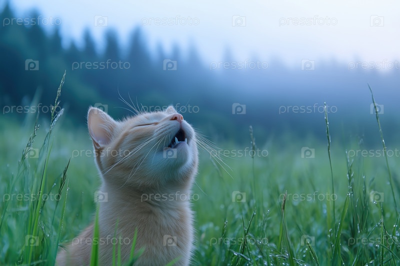 Котенок зевает на лугу на открытом воздухе