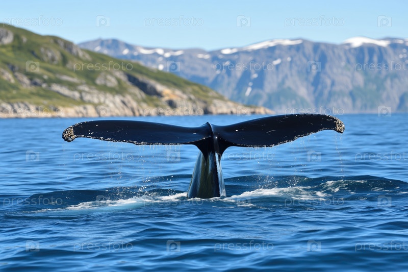 Хвост ныряющего кита виден среди волн у скалистого берега