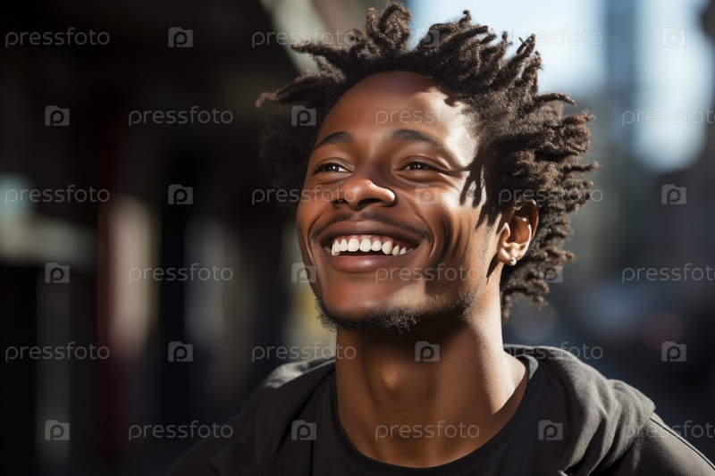 Портрет счастливого улыбающегося мужчины на размытом городском фоне