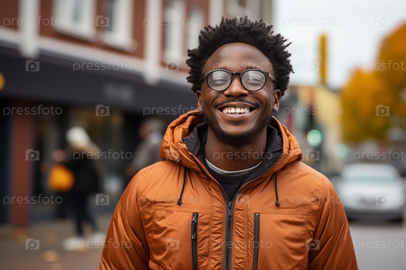 Портрет счастливого улыбающегося мужчины на размытом городском фоне