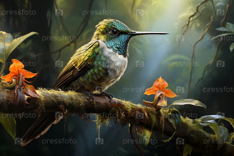 Колибри в тропическом лесу, реалистичная картина в винтажном стиле