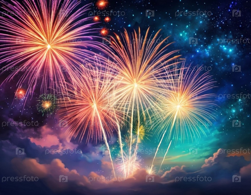 Яркое представление фейерверков освещает ночное небо. Большие вспышки света освещают темный холст выше, создавая завораживающее зрелище цвета и движения. Сгенерировано ИИ. Праздничный фон