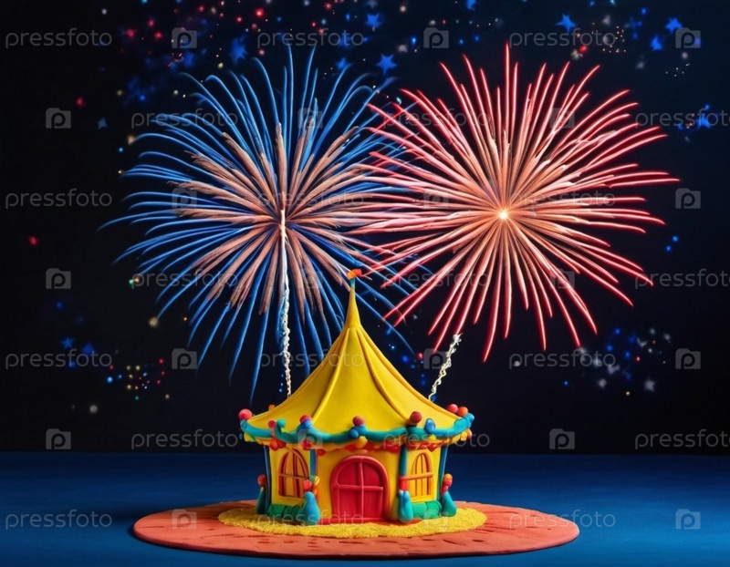 Причудливая ночная сцена с пластилиновым замком, освещенным теплым светом, с красочными фейерверками, взрывающимися над ним. Праздничная и волшебная атмосфера. Создано ИИ. Фейерверки на празднике