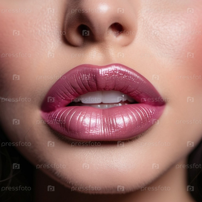 Крупный план женских губ с мерцающей розовой помадой, которая добавляет немного блеска. Губы слегка приоткрыты, открывая вид на белые зубы. Чувственность и сексуальность. Создано с помощью ИИ