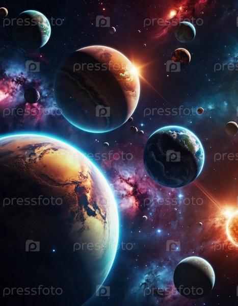 Планетарная система с несколькими планетами, большим ярко окрашенным газовым гигантом и каменистой планетой. Яркие звезды и огромное пространство темного космоса с галактикой на заднем плане. Космические просторы. Космонавтика. ИИ