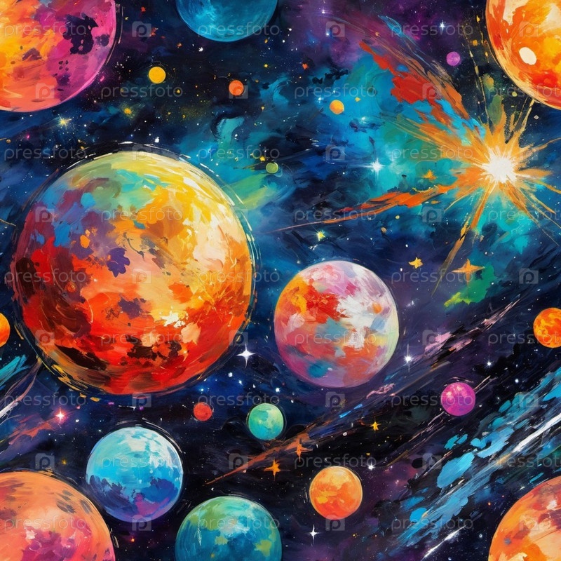 Планетарная система с несколькими планетами, большим ярко окрашенным газовым гигантом и каменистой планетой. Яркие звезды и огромное пространство темного космоса с галактикой на заднем плане. Космические просторы. Космонавтика. ИИ