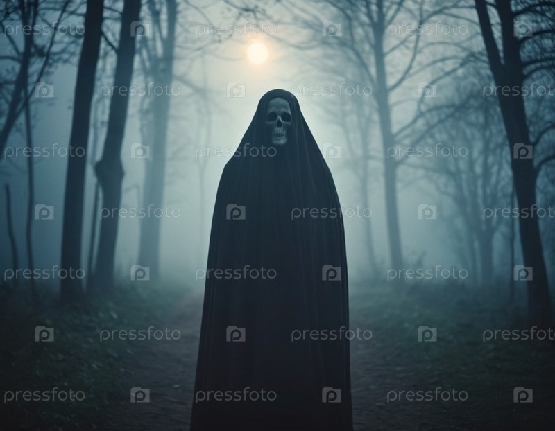Призрачная фигура зловеще стоит в темном лесу. Слабое свечение света исходит сзади. Тревожная атмосфера. Чувство страха и ужаса, навязчивый опыт, напоминающий классические рассказы ужасов. ИИ