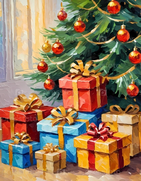 Декорированная рождественская елка, украшенная красочными игрушками и сложенными подарками, готова к празднованию в уютной праздничной обстановке. упакованные подарки разных цветов. Праздничная атмосфера, теплота и радость. AI