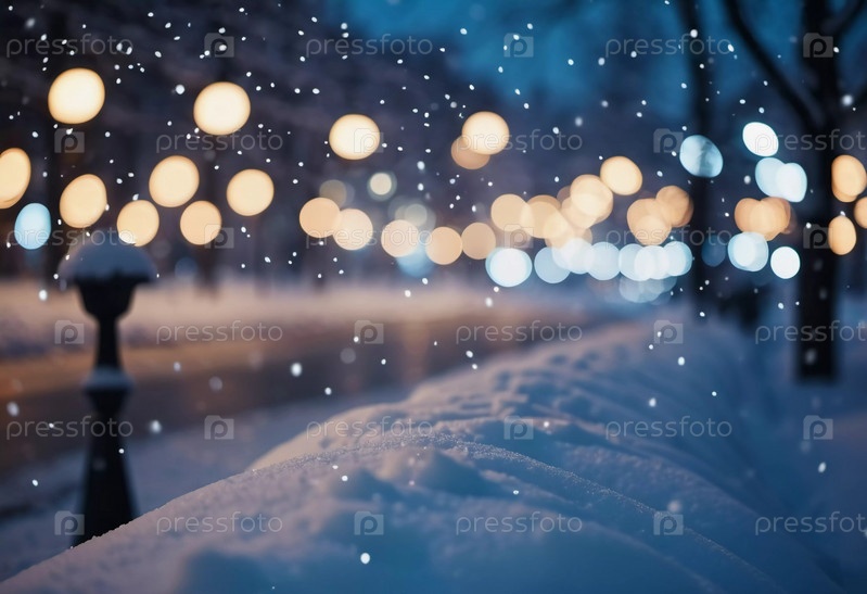Зима приносит мягкий снегопад на городские улицы, где разноцветные огни висят над головой, создавая теплую и праздничную атмосферу. Эффект боке от огней добавляет причудливый штрих, подчеркивая радость сезона