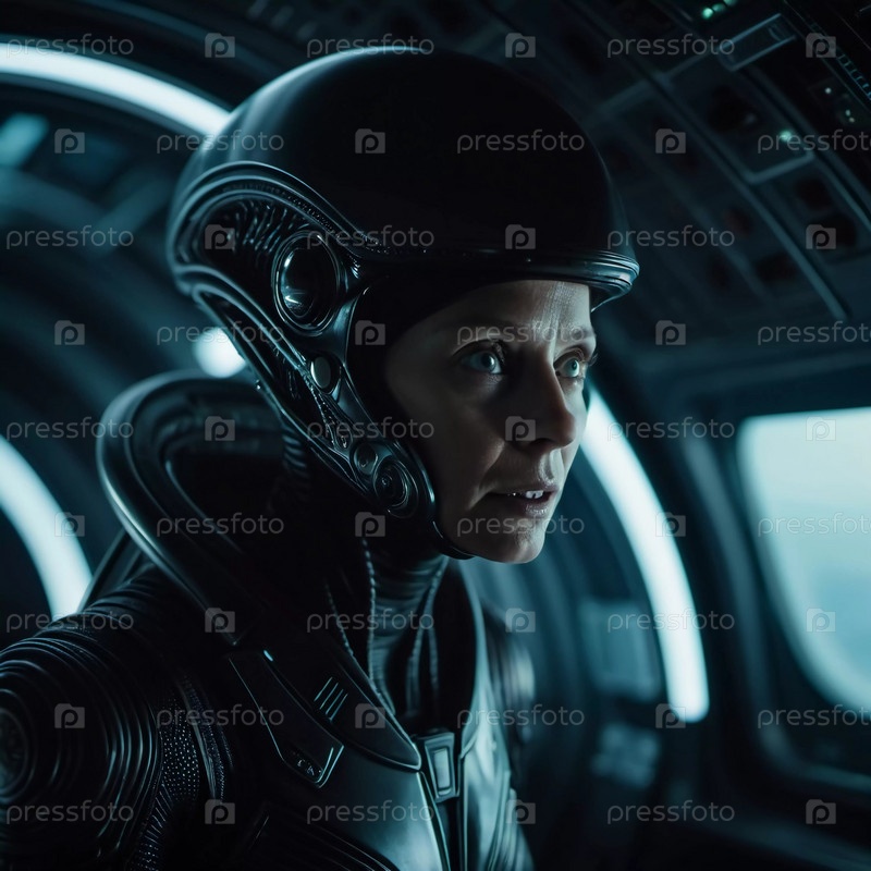 Встреча с инопланетянами на борту космического корабля, исследующего пустоту, с акцентом на члене экипажа, выражающем глубокую концентрацию во время навигации в космосе. Генеративный ИИ