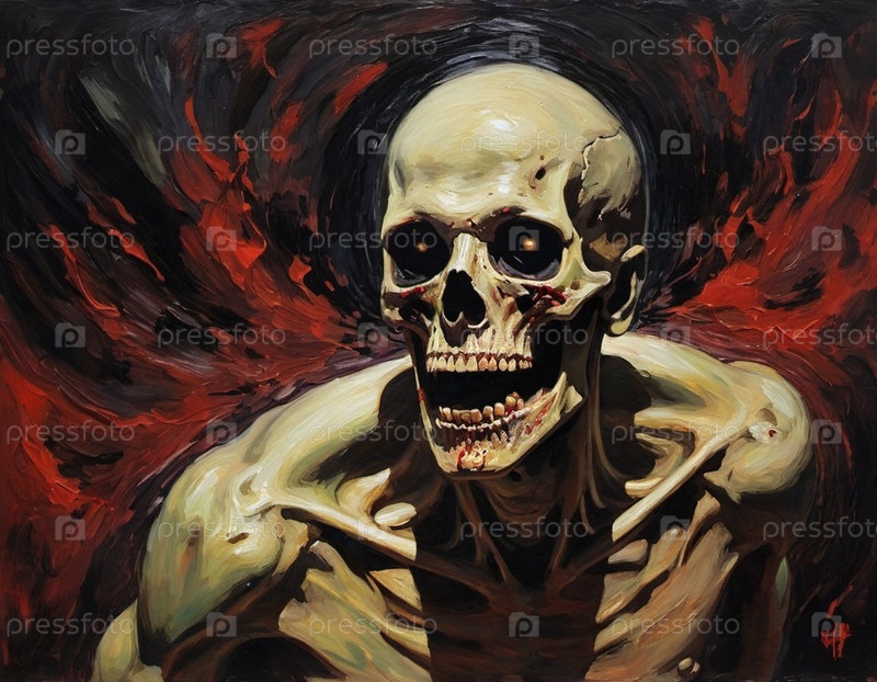 Пробуждение зловещего в темной, жуткой обстановке, демонстрирующей подробный и выразительный человеческий скелет, который вызывает чувство таинственности и предчувствия. Генеративный ИИ