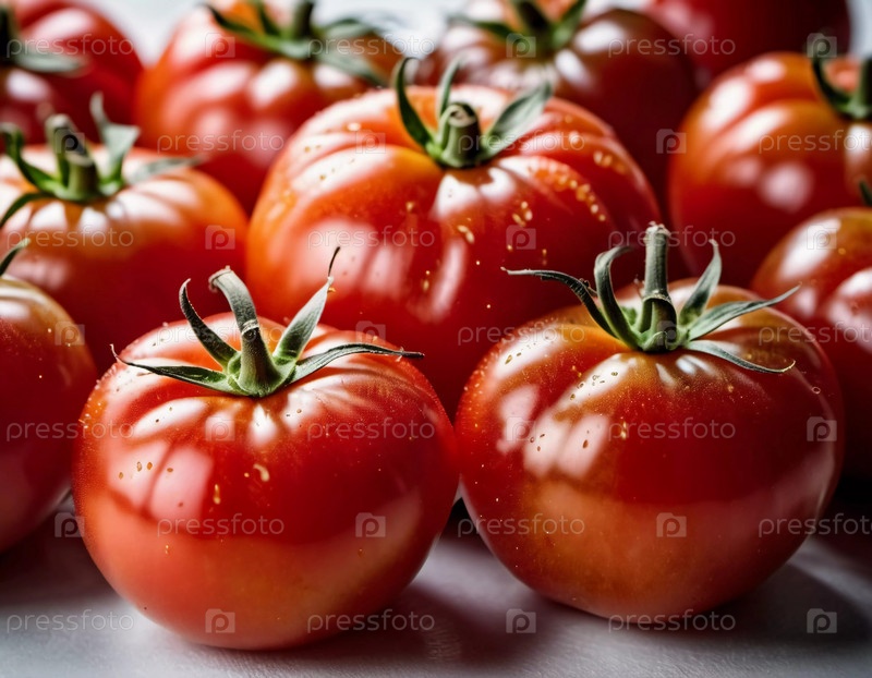 Группа спелых красных томатов. Томаты расположены гроздью. Свет отражается от поверхности томатов, подчеркивая их яркий цвет и блестящую текстуру. Они были недавно собраны. Сгенерированы ИИ