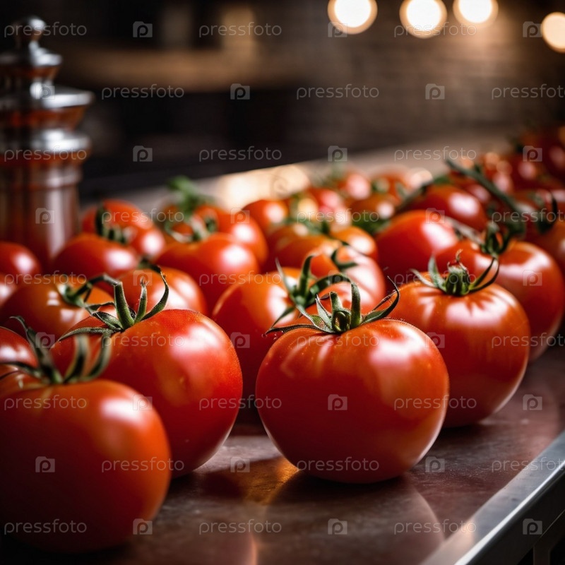 Супермаркет, полный красных томатов. Томаты сложены гроздьями. Свет отражается от поверхности томатов, подчеркивая яркий цвет и блестящую текстуру. Они были недавно собраны. Сгенерировано с помощью ИИ