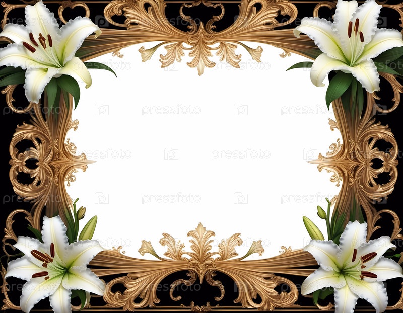 Изысканная рамка с яркими белыми лилиями на черном фоне. Золотые украшения добавляют изысканности, что делает ее идеальной для приглашений или объявлений. Генеративный ИИ