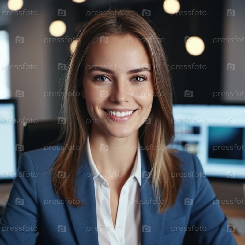 Профессиональная белая женщина в синей рубашке сидит за своим столом в современном офисе, излучая уверенность и позитив. Окружающая среда усиливает ее доступное поведение. Генеративный ИИ