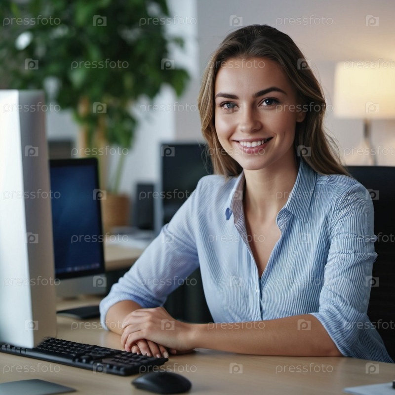Профессиональная белая женщина в синей рубашке сидит за своим столом в современном офисе, излучая уверенность и позитив. Окружающая среда усиливает ее доступное поведение. Генеративный ИИ