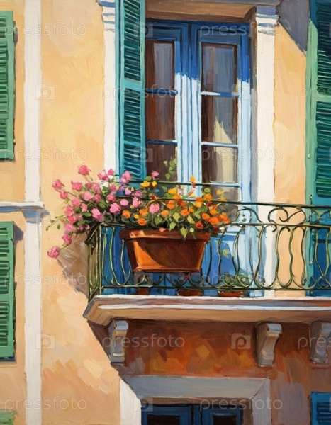 Типичный французский или итальянский балкон с цветочными горшками, вид снизу улицы. Солнечная терраса, окруженная яркими цветами, располагает к отдыху, предлагая уютное место со столом и стульями. Генеративный ИИ
