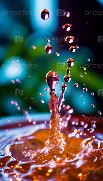 Множество ярких капель взрываются красочным всплеском, создавая потрясающую демонстрацию ярких оттенков на мягко размытом фоне. Застывшее движение. Красота природы в данный момент. ИИ