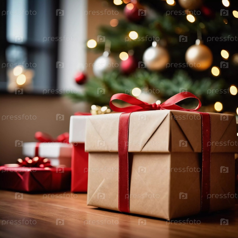 Уютная гостиная, украшенная праздничной рождественской елкой, украшенной сверкающими огнями и красочными безделушками, окруженная множеством тщательно упакованных подарочных коробок, ожидающих открытия. Искусство ИИ