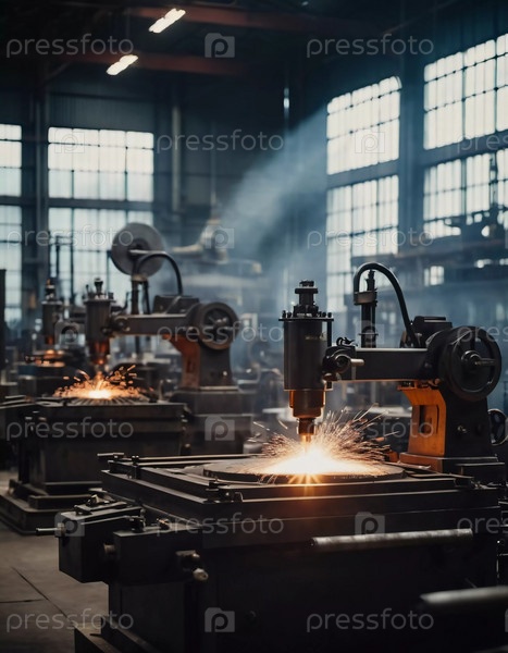 Производственное литейное предприятие, заполненное фрезерными станками, активно производит компоненты. Окружающая среда промышленная, характеризуется наличием инструментов машин, видимыми искрами, что предполагает точную работу. ИИ