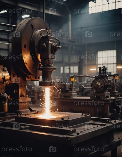 Производственное литейное предприятие, заполненное фрезерными станками, активно производит компоненты. Окружающая среда промышленная, характеризуется наличием инструментов машин, видимыми искрами, что предполагает точную работу. ИИ