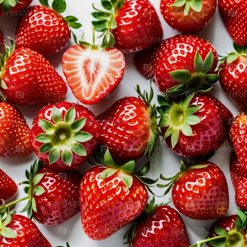 Гроздь свежей, ярко-красной клубники демонстрирует свой естественный блеск и уникальную текстуру, подчеркивая ее спелость и свежесть. Генеративный ИИ