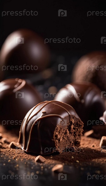 Ассорти из трюфелей из темного шоколада окружает квадрат из темного шоколада, все покоится на подложке из какао-порошка, что подчеркивает их роскошную текстуру и насыщенность. Генеративный искусственный интеллект