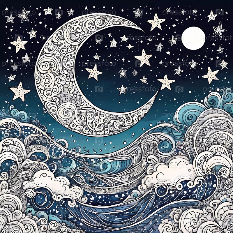 На рисунке изображен детализированный полумесяц на фоне бурлящих океанских волн и мерцающие звезды на темно-синем ночном небе, что создает успокаивающую атмосферу. Генеративный ИИ