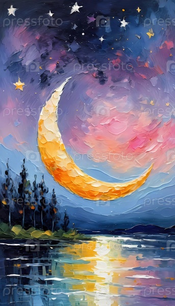 Захватывающий полумесяц ярко светит над спокойным озером, окруженным деревьями и небом, окрашенным в оттенки розового и фиолетового, создавая мирную атмосферу сумерек. Генеративный ИИ