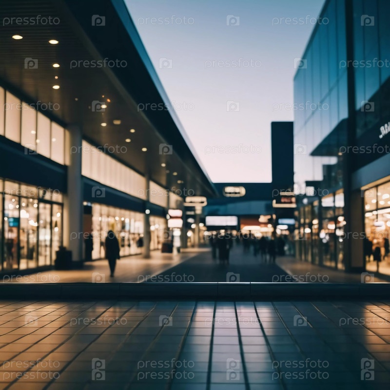 Посетители прогуливаются по оживленному торговому центру вечером. Теплый свет создает гостеприимную атмосферу, а эффекты боке усиливают общую эстетику. Современная архитектура. Генеративный ИИ
