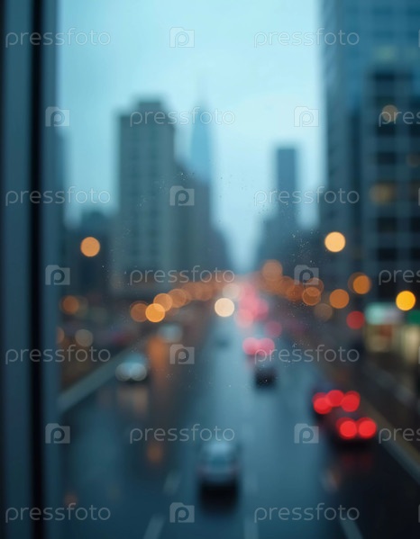 Размытая перспектива демонстрирует современный городской горизонт через стеклянную стену в сумерках, раскрывая яркость и сложность городской жизни. Угасающий свет отражает городскую энергию. Генеративный ИИ