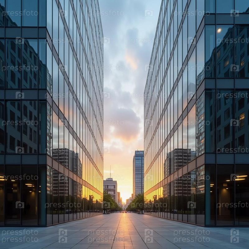 Высокое офисное здание с большими стеклянными окнами отражает яркие цвета заката.Городская обстановка и чистое небо создают спокойную атмосферу, когда день переходит в ночь