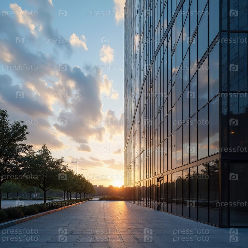 Высокое офисное здание с большими стеклянными окнами отражает яркие цвета заката.Городская обстановка и чистое небо создают спокойную атмосферу, когда день переходит в ночь