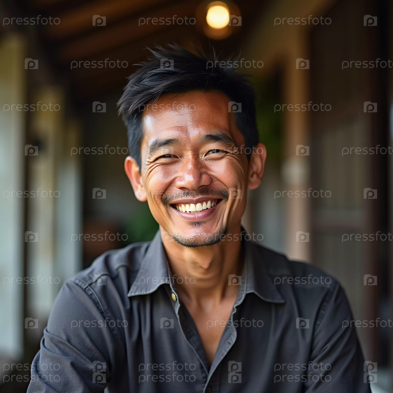 Веселый житель Таиланда, одетый в темную рубашку, широко улыбается, сидя на открытом воздухе. Генеративный ИИ