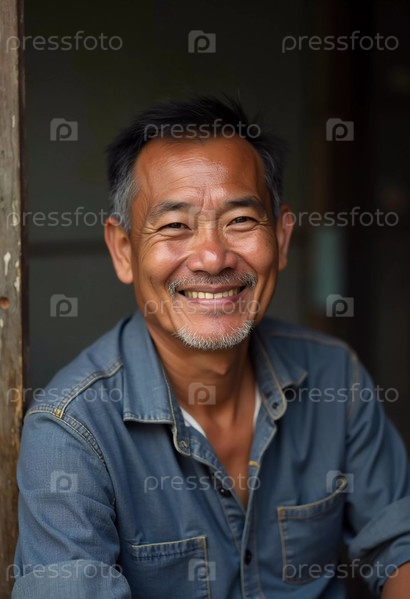 Веселый житель Таиланда широко улыбается, демонстрируя свое теплое отношение. Обстановка отражает традиционный деревянный дом, освещенный естественным светом, что добавляет ощущение спокойствия. Генеративный ИИ