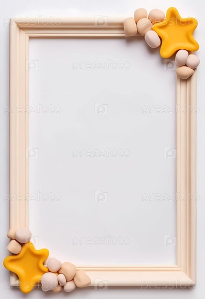 Эта декоративная рамка демонстрирует игривые элементы, выполненные из яркого пластилина, с очаровательными звездами и мягкими бусинами на нейтральном фоне, идеально подходящим для художественных экспозиций