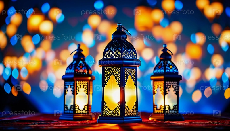 Яркие арабские фонарики ярко светят в праздничную ночь Рамадана, создавая теплую и уютную атмосферу для празднования и общественных собраний. Генеративный ИИ