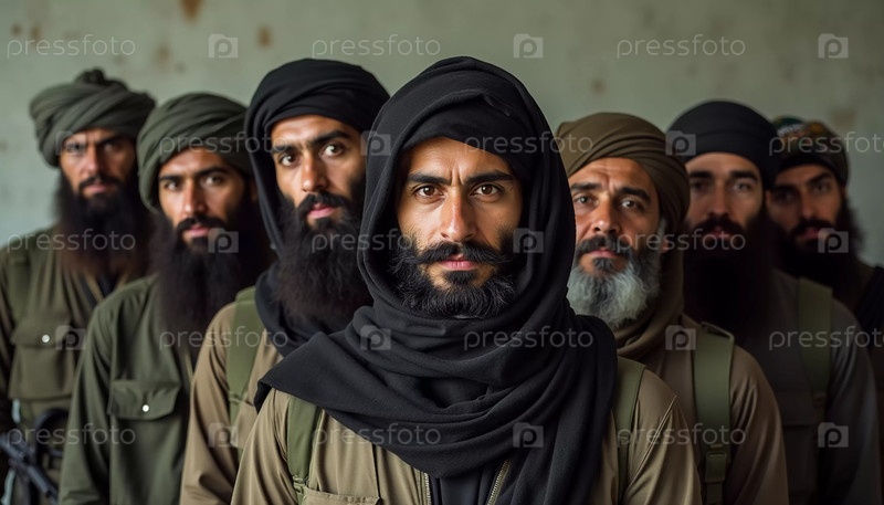 Группа вооруженных мужчин, одетых в традиционную одежду, стоит сплоченно, демонстрируя товарищество и готовность. Воинствующие мусульмане, похожие на Талибан или пакистанскую армию. Густая борода. Генеративный ИИ