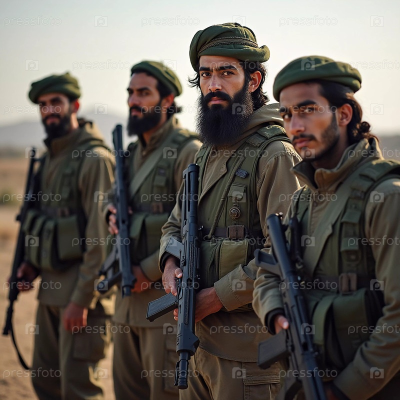 Группа вооруженных мужчин, одетых в традиционную одежду, стоит сплоченно, демонстрируя товарищество и готовность. Воинствующие мусульмане, похожие на Талибан или пакистанскую армию. Густая борода. Генеративный ИИ