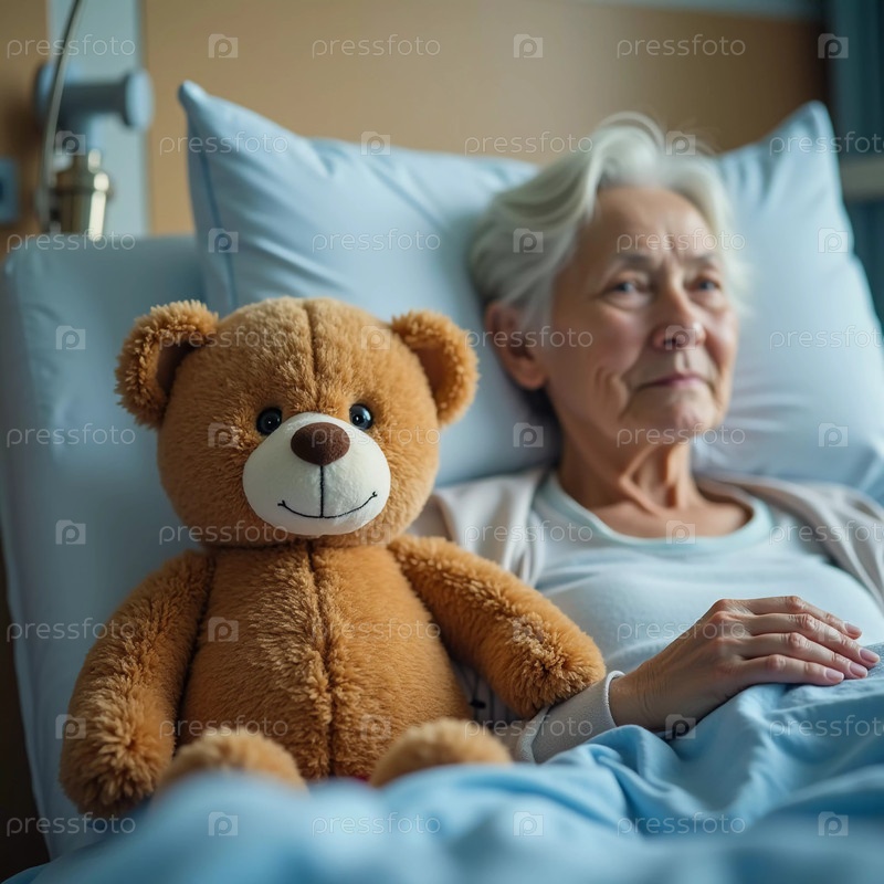 Пожилая женщина отдыхает в больничной палате, ее взгляд отстраненный, но спокойный. Рядом с ней мягкий плюшевый мишка предлагает ей компанию, символизируя тепло среди ее трудностей