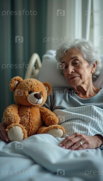Пожилая женщина отдыхает на больничной койке, ее взгляд нежно устремлен на плюшевого мишку рядом с ней. Этот тихий момент передает суть комфорта и стойкости в сложные времена