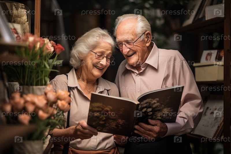 Пожилая пара смотрит фотоальбом в помещении