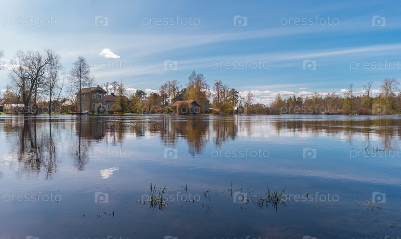 Приозерск, Россия. Полноводная река Вуокса в весенний день. Пейзаж с домами