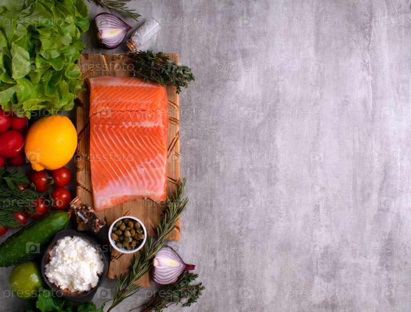 Филе соленой форели на деревянной доске в окружении ингредиентов для приготовления закуски. Вид сверху. Здоровое питание. Копировать пространство