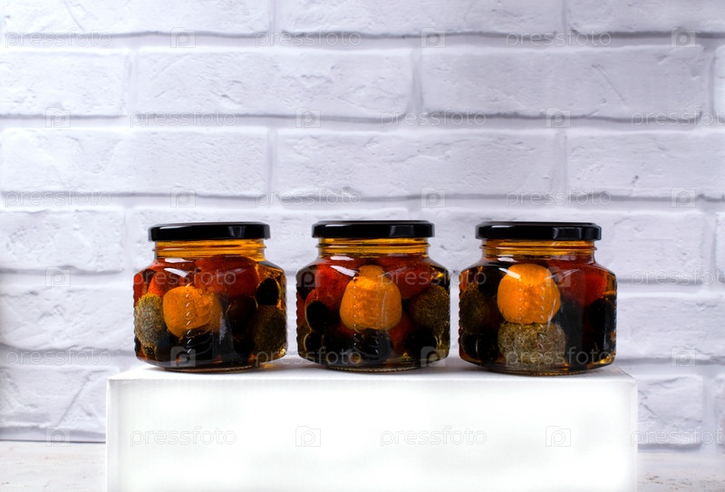 Сырные шарики из йогурта Лабне в специях в стеклянных банках на белом фоне. Блюдо ближневосточной кухни